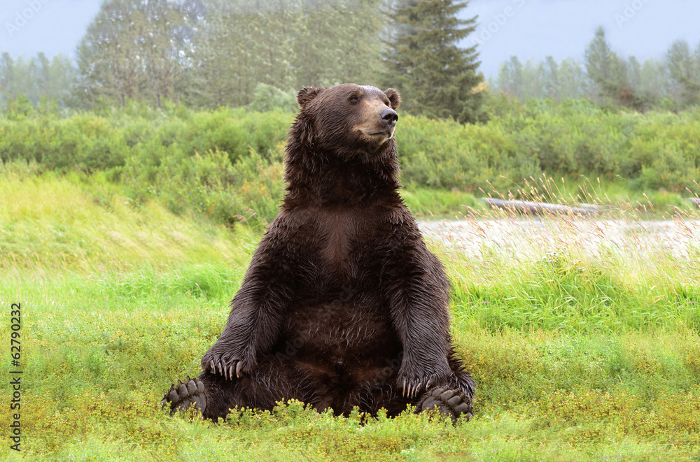 Poster Foto Grizzly Bear Sitting On The Grass Coastal by europosters.nl