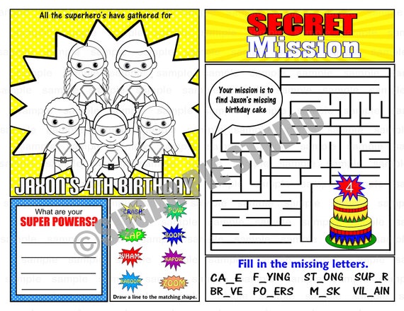 Gepersonaliseerde Afdrukbare Comic Boek Superheld Meisje Jongen Verjaardag Partij Voordeel Childrens Kinderen Kleurplaten Pagina Activiteit Pdf Of by etsy.com