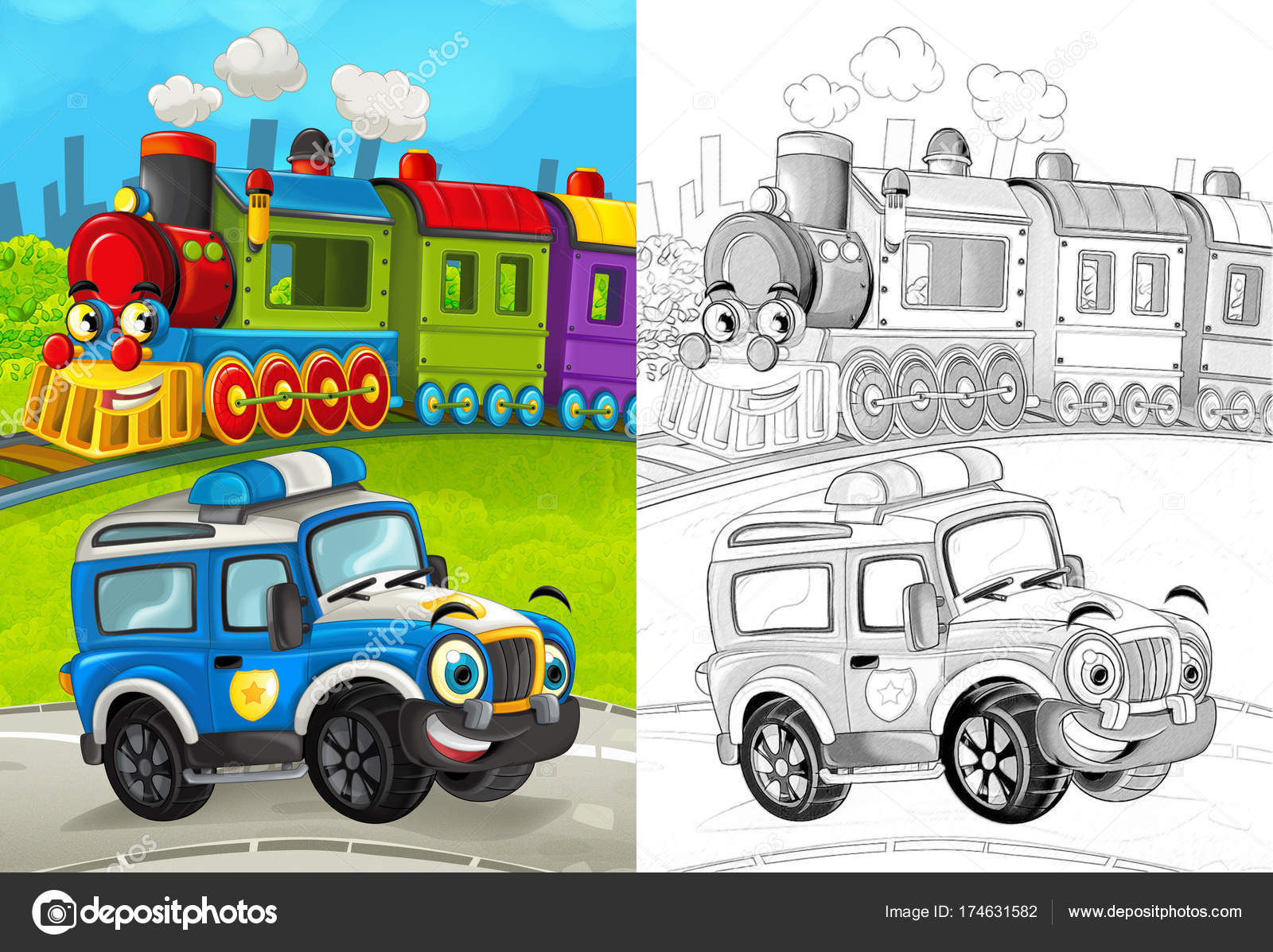 Cartoon Scene Met Gelukkig Politie Auto Weg Trein Met by nl.depositphotos.com